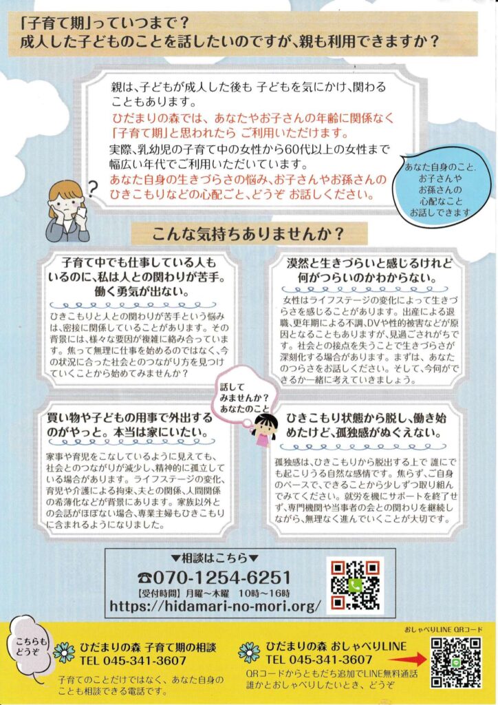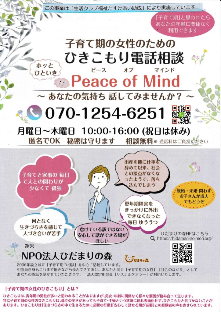 ホッとひといき「Peace of Mind」あなた自身の生きづらさの悩み、お子さんやお孫さんのひきこもりなどの心配事、どうぞお話ください。
